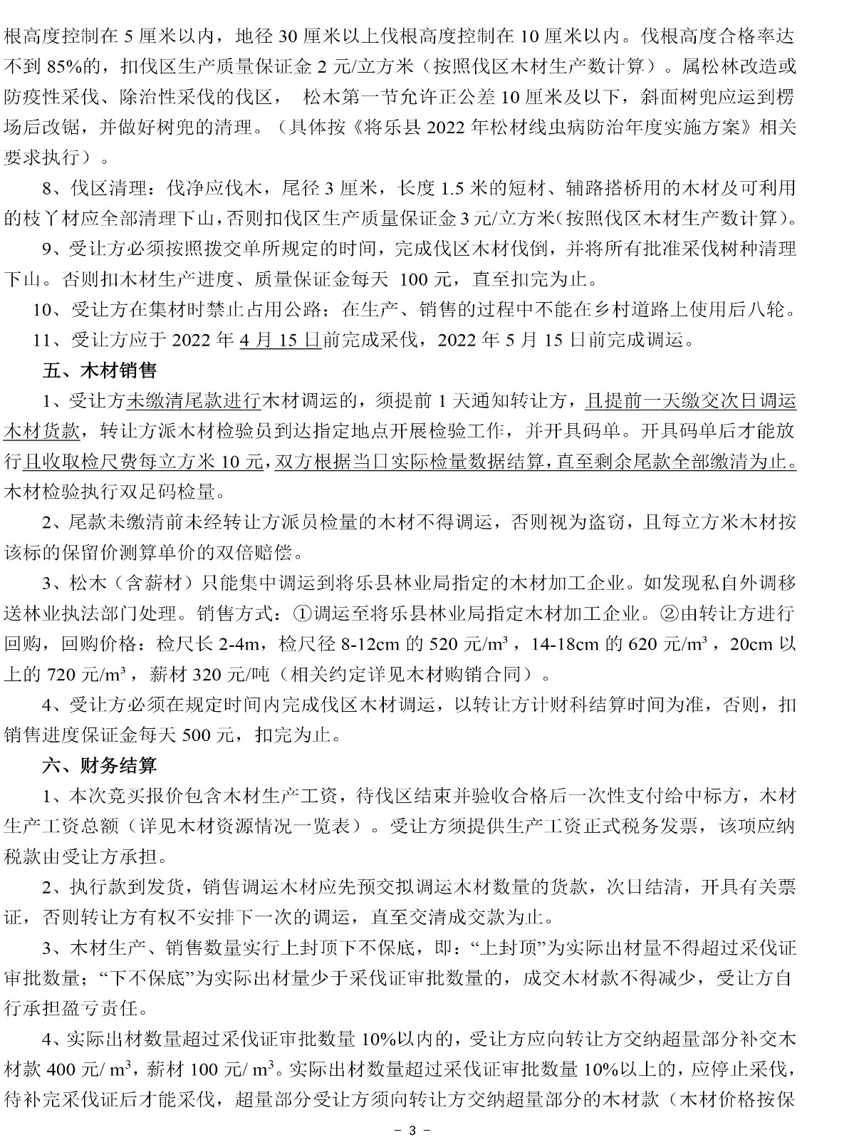 重要信息披露 | 1、標的簡介所列的出材量等數據僅供參考,標的以現狀交付,轉讓方及交易中心不承擔標的面積與實測面積、標的出材量與實際出材量差異等責任,不調整相應的成交價格。 2、本次競買報價包含木材生產工資,木材生產工資總額詳見木材資源情況一覽表,待伐區結束并驗收后一次性支付給受讓方。 3、銷售費用、成交后發生的政策變化費用、稅收均由受讓方承擔。 4、松木(含薪材)只能集中調運到將樂縣林業局指定的木材加工企業。如發現私自外調的,將移送林業執法部門處理。銷售方式:①調運至將樂縣林業局指定木材加工企業。②由轉讓方進行回購(相關約定詳見木材購銷合同)。 5、受讓方應于2022年4月15日前完成采伐,2022年5月15日前完成調運。 6、未盡事宜詳見木材資源情況一覽表、競買約定、木材生產承包合同(范本)、木材購銷合同(范本)、伐區位置示意圖等本公告其他附件。 | ||